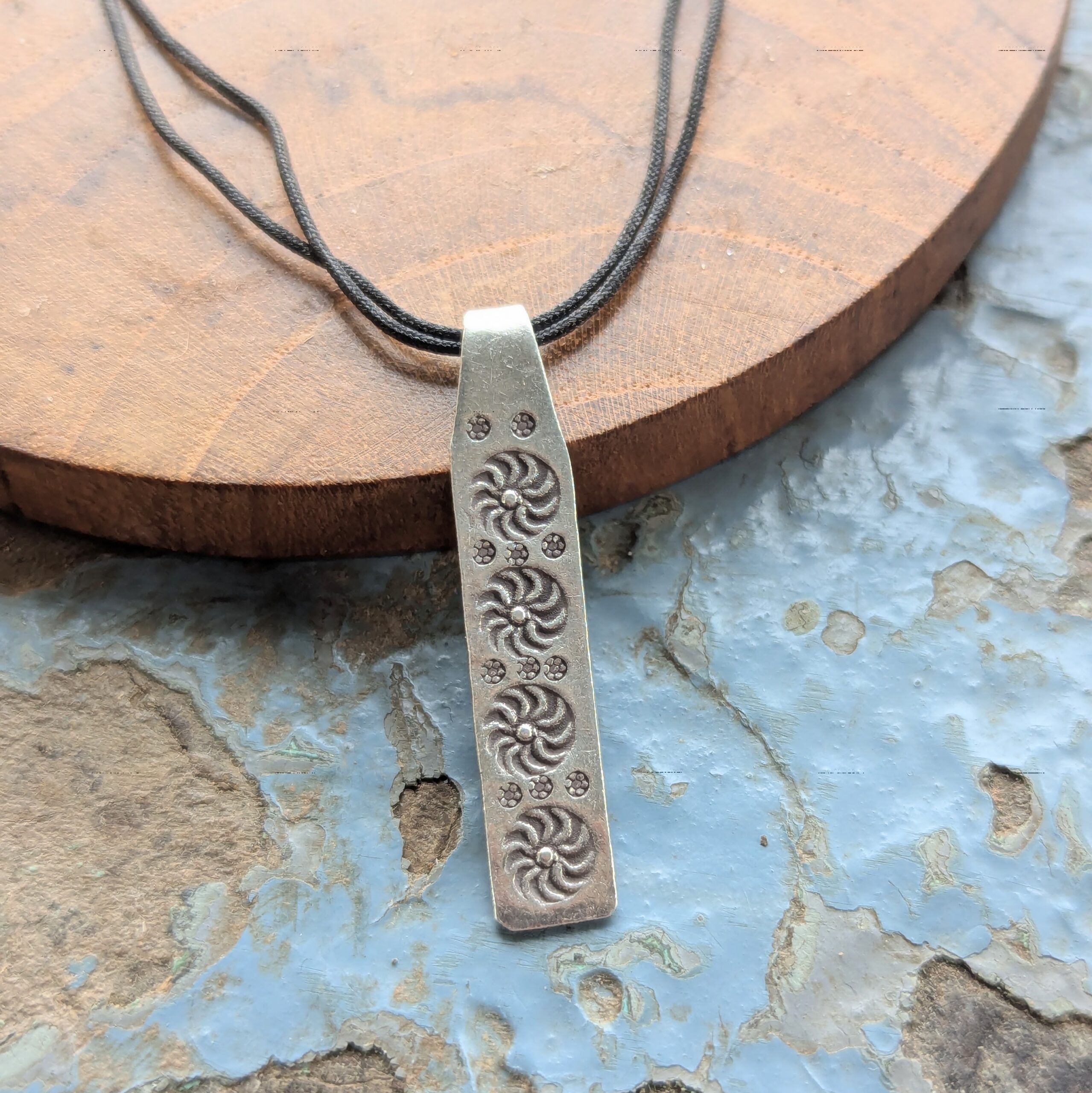 The Lou Pendant is a bold and striking pendant. A flat rectangular drop pendant with swirl design oxidised stamped detailing along the length of the pendant.