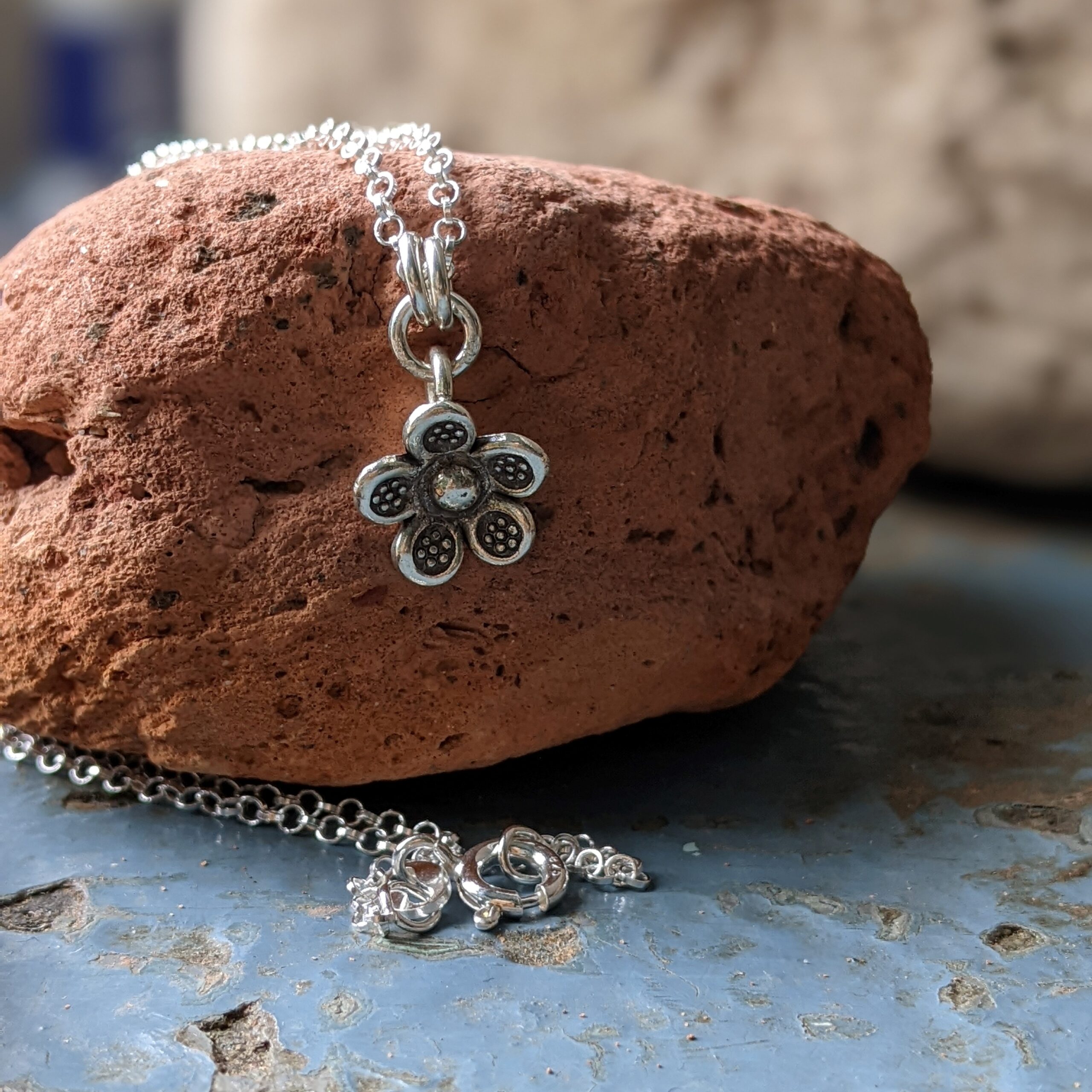 The Minka Flower Pendant is a cute flower complete with tiny oxidised flower stamping on each petal.