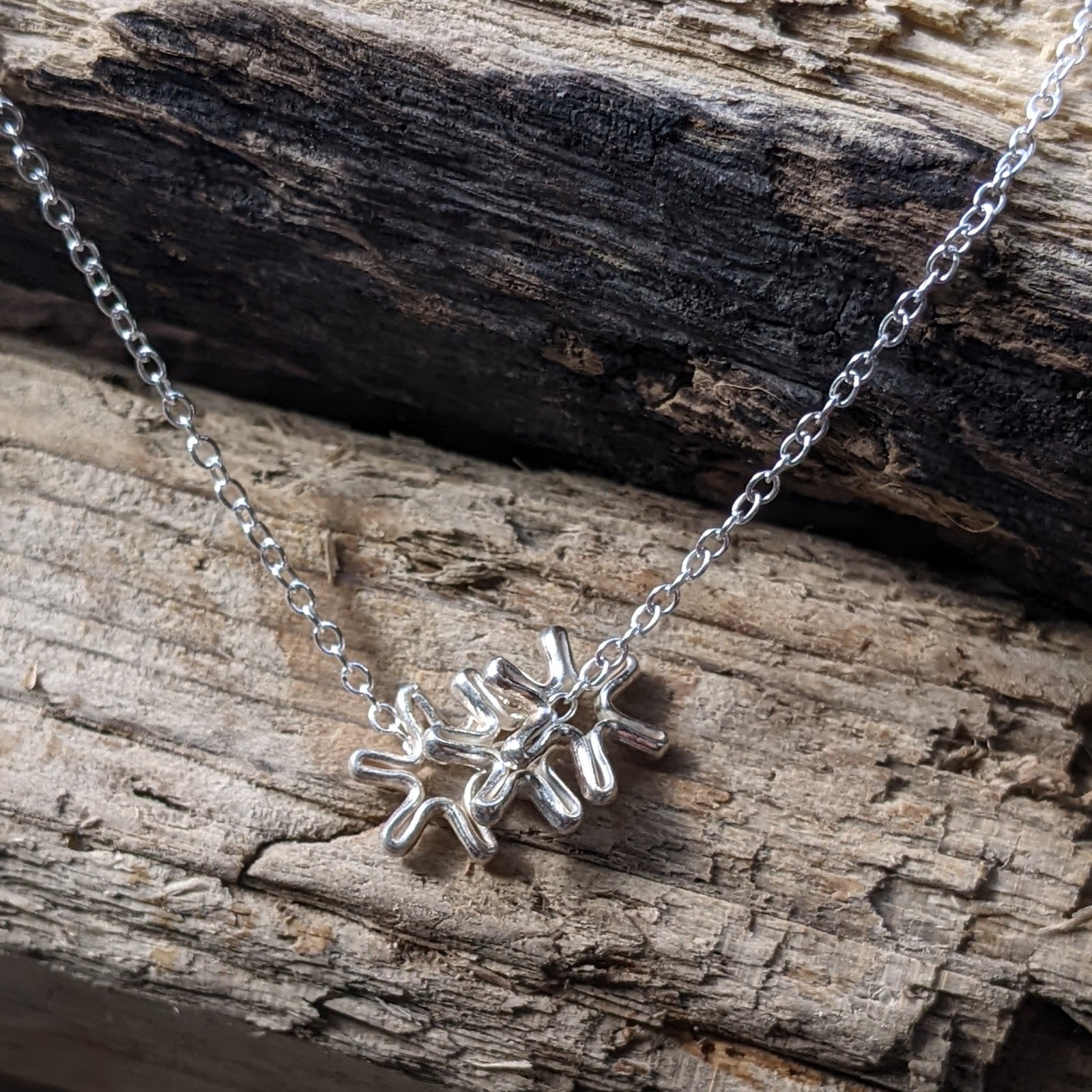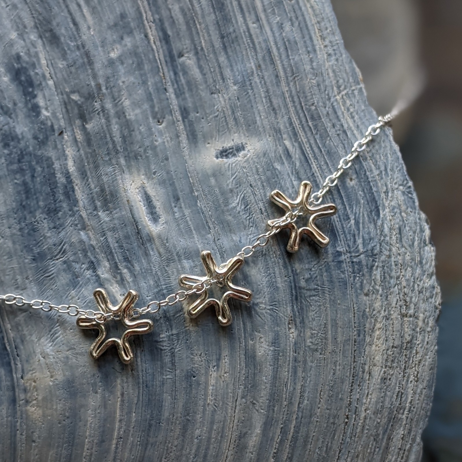 The Phoebe Flower Necklace is a delicate chain with three tiny flower charms. Small but perfectly formed!