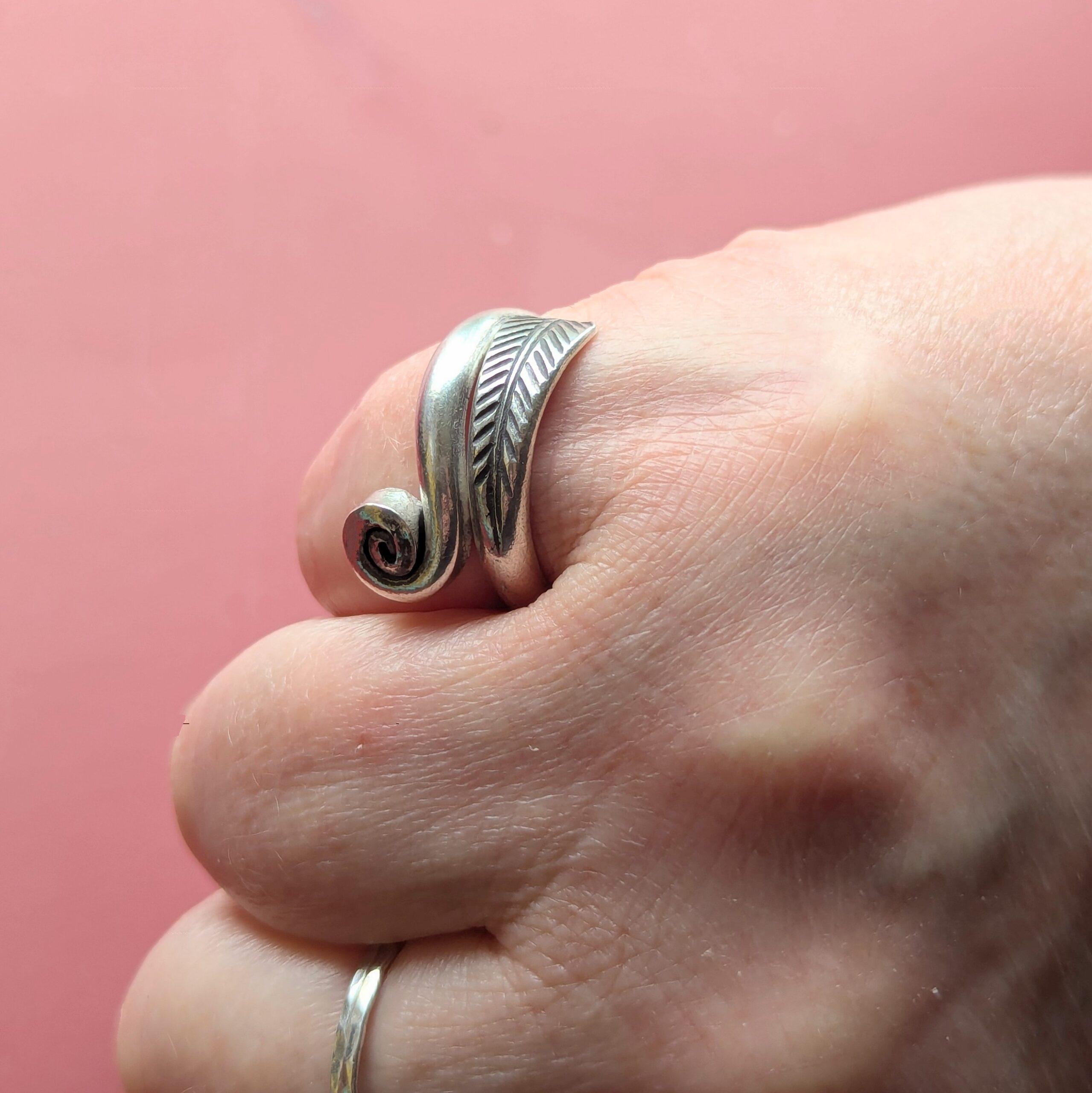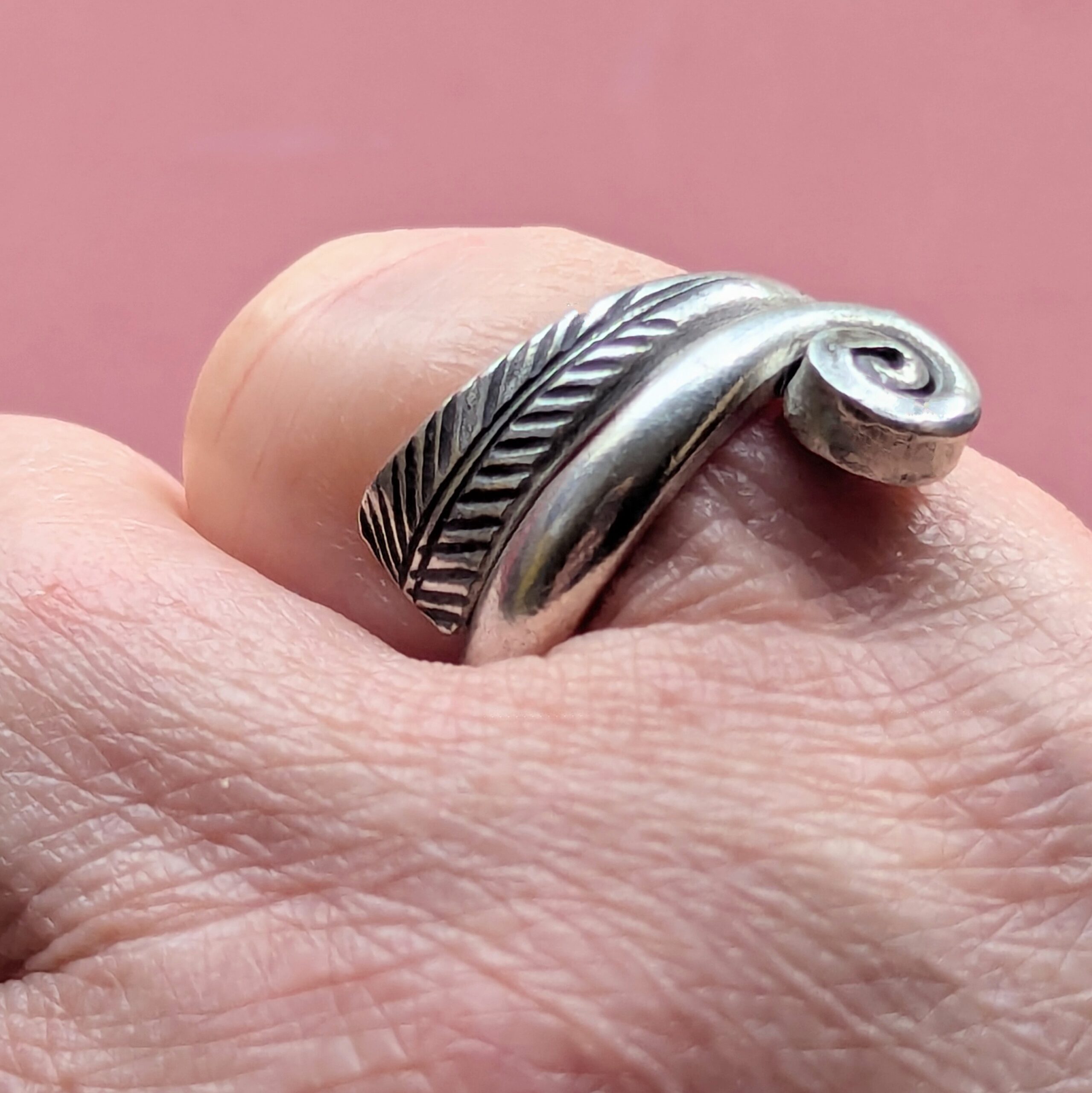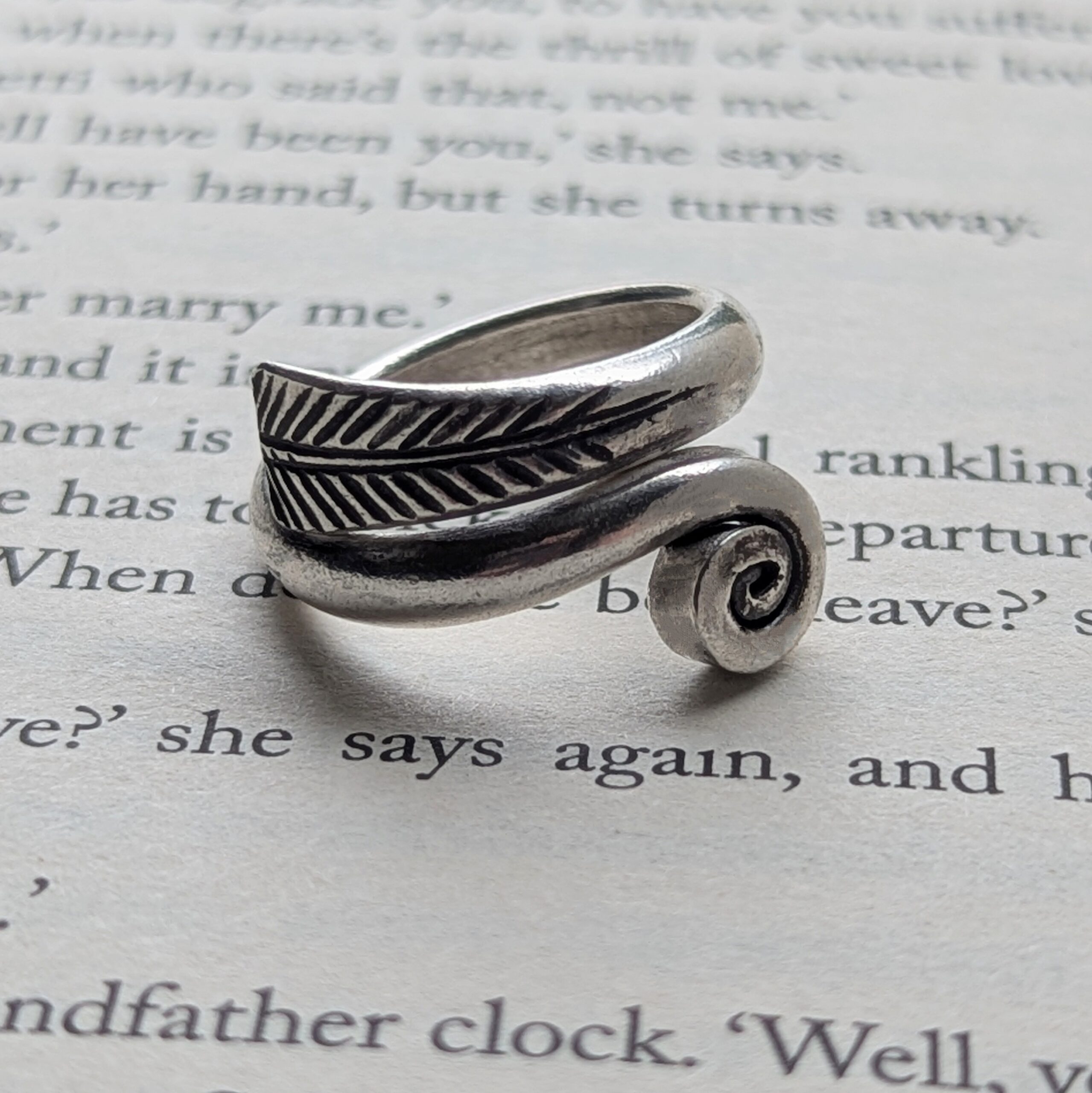 The Rafferty Ring has a wraparound design and is completed with bold oxidised feather patterning and a feature spiral. Tribal feel for unique people wanting something a little different.