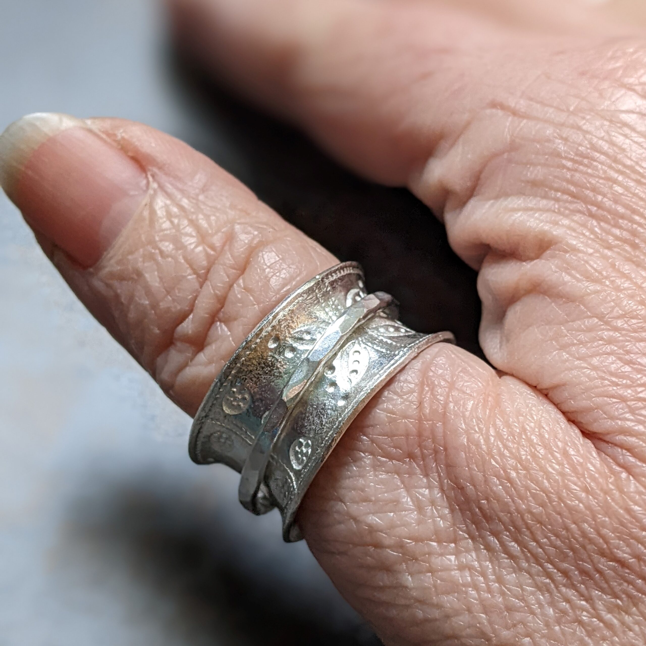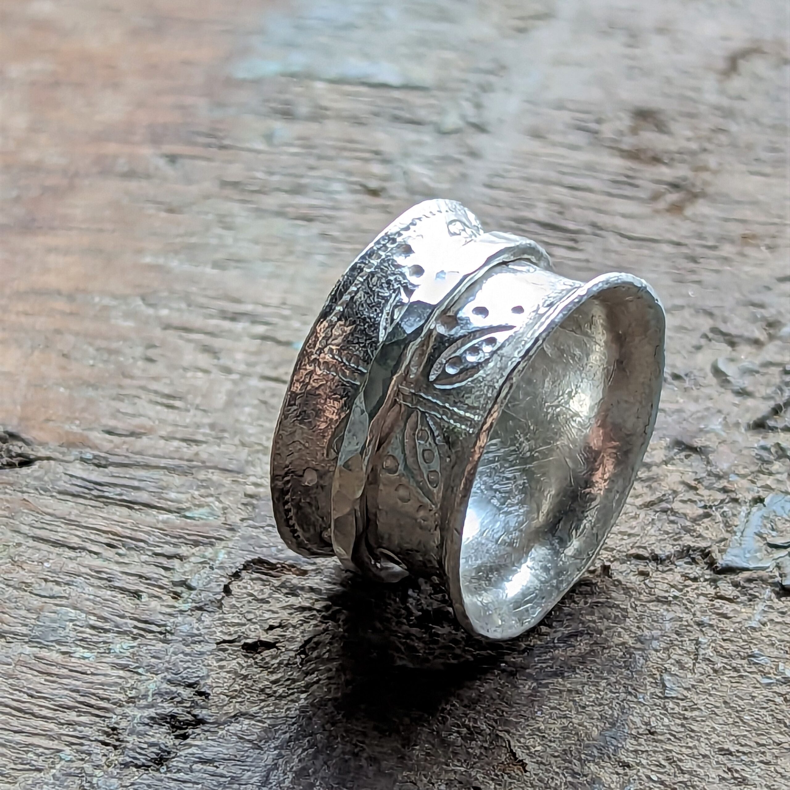 The spinning central ring has been created from recycled silver and given a contrasting hammered finish.