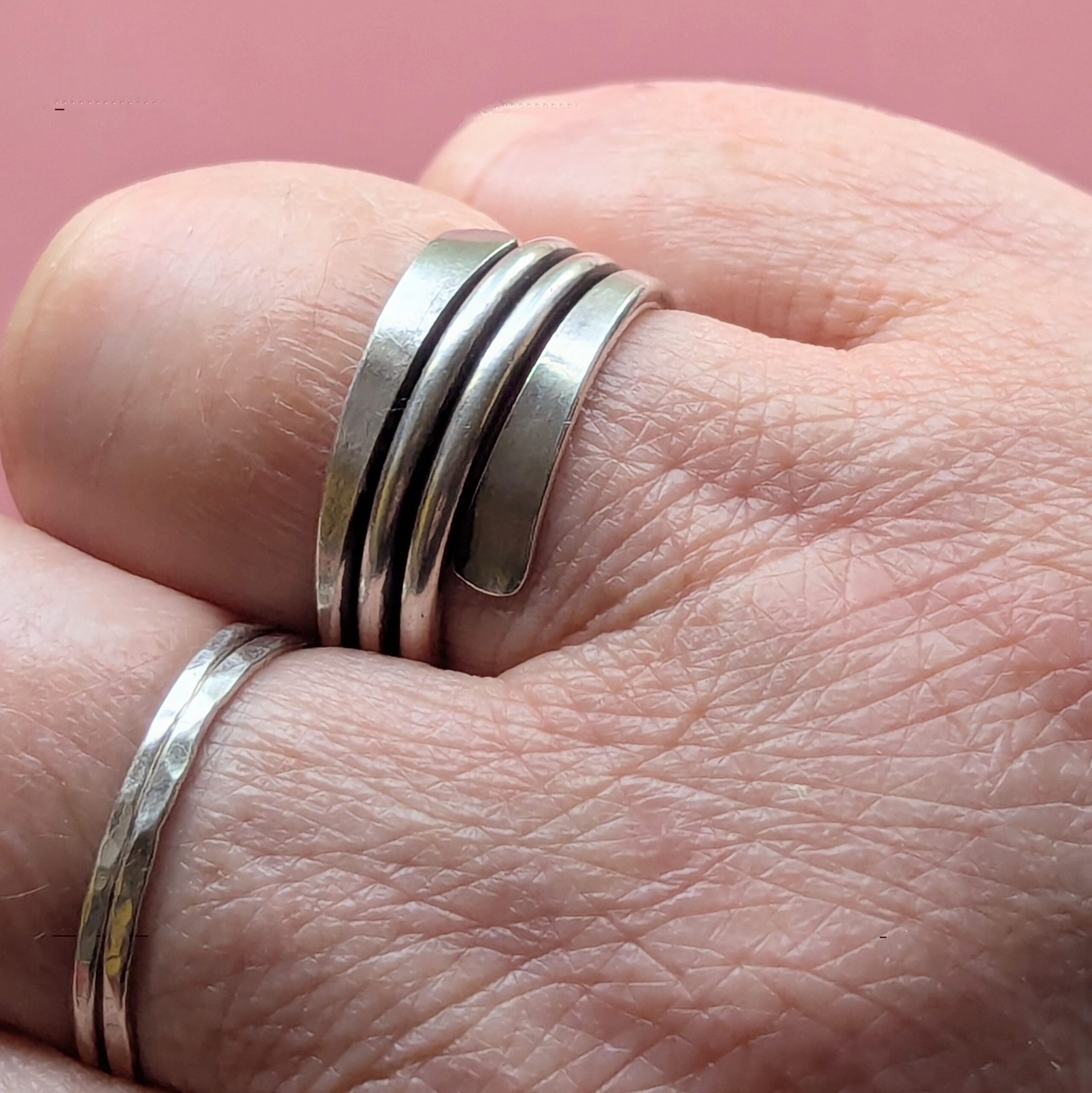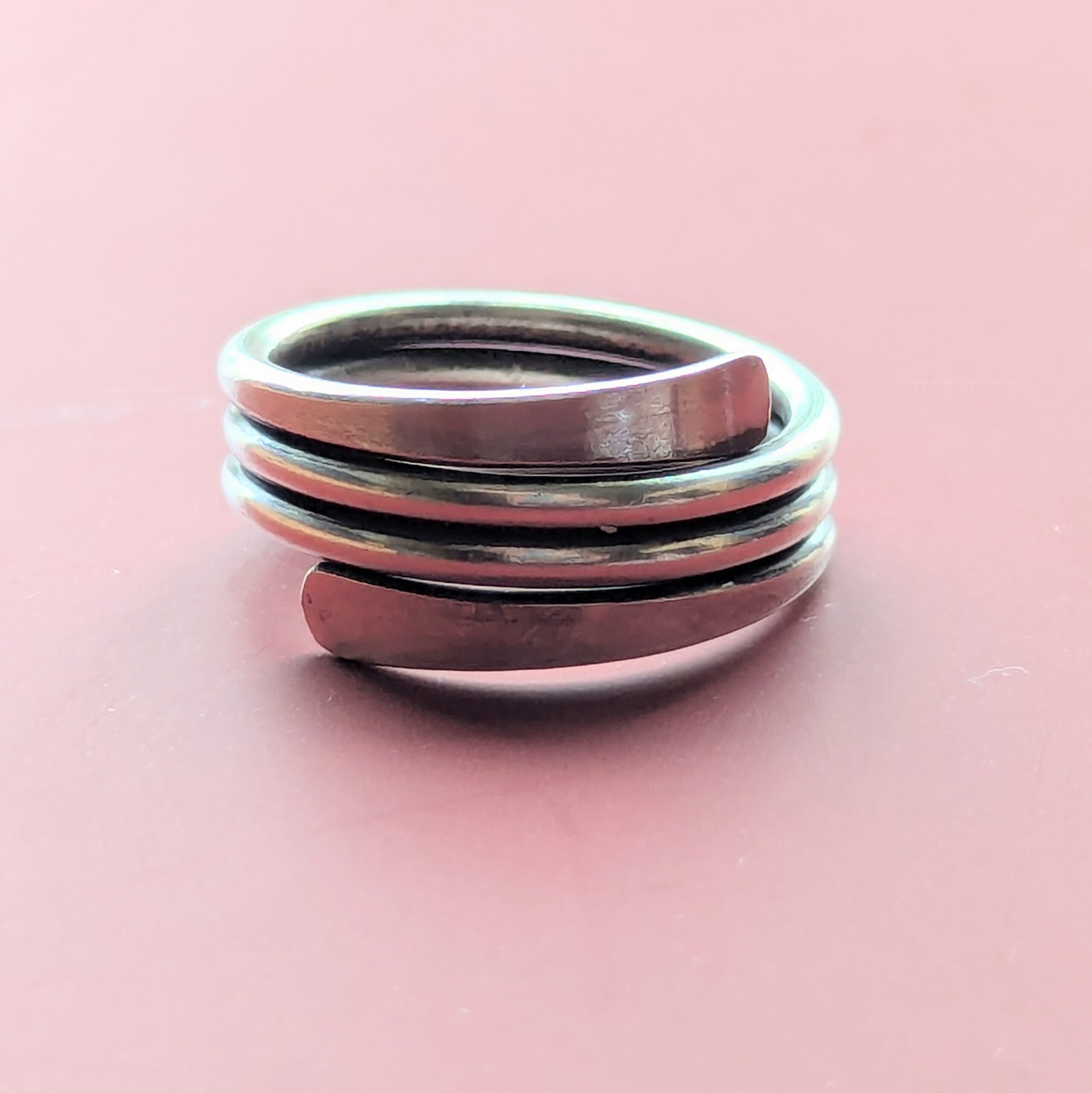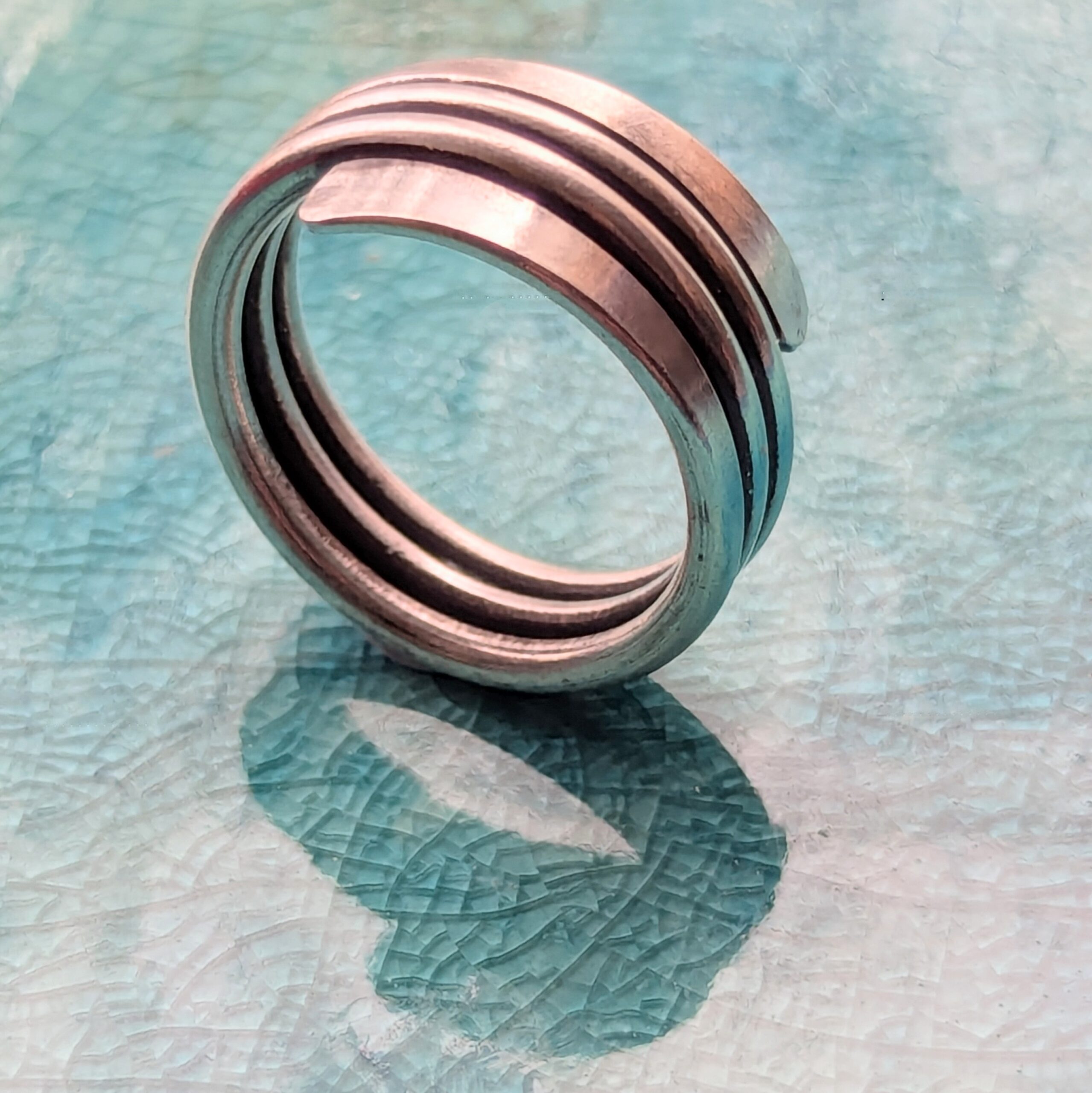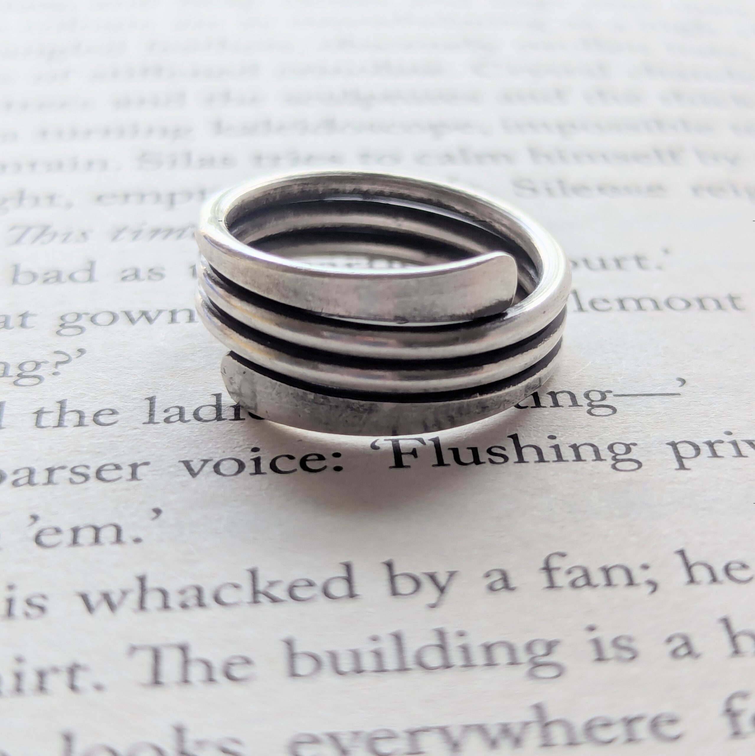 The Ruthie Ring has a double loop wraparound design and is oxidised to allow this banding to stand out.