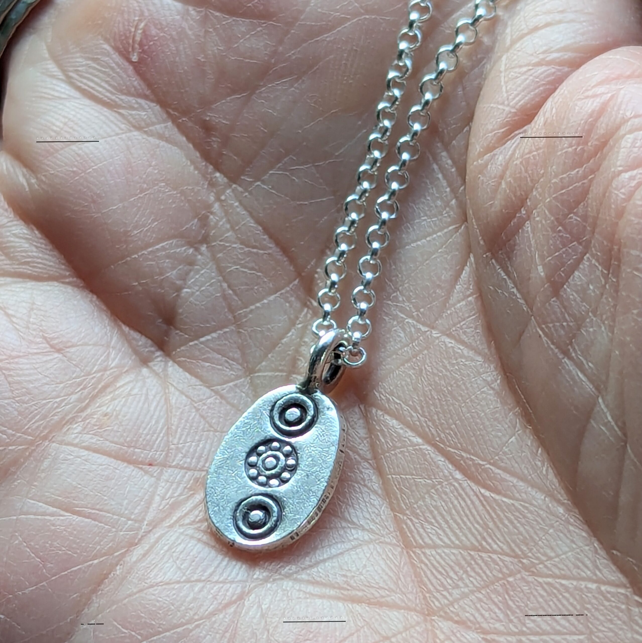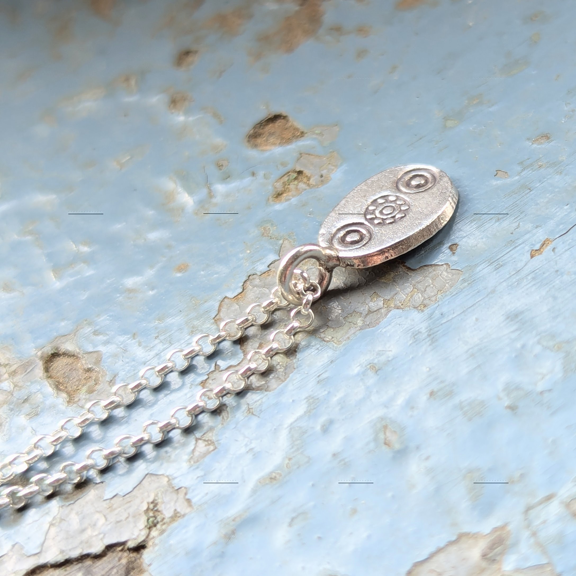 The Tegan Pendant is a small oval disc with pretty oxidised stamping. Great for everyday wear and lovely layered with different length necklaces.